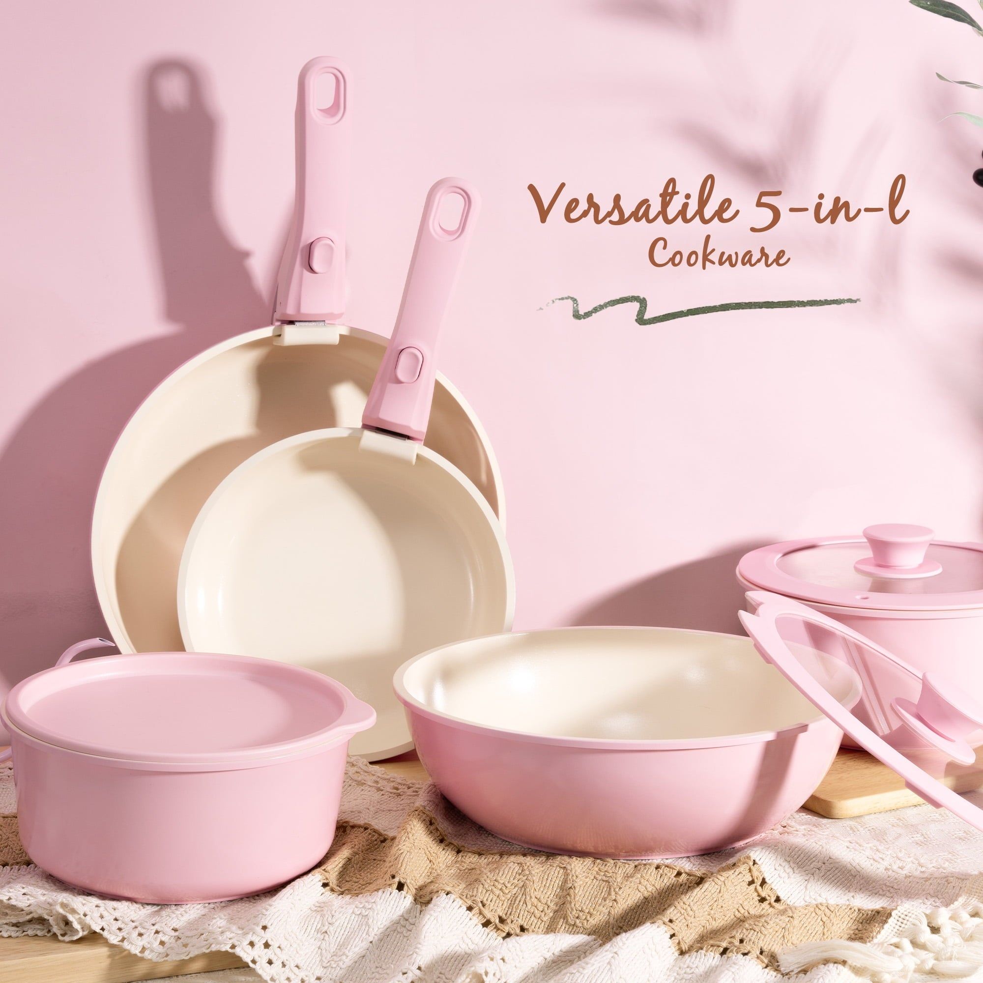 Astercook 20-Piece Ceramic Pots and Pans Set, Nonstick Cookware Set with Detachable Handles, Oven Safe to 480°F, Induction Compatible, Stackable RV Kitchen Cooking Set, Pink